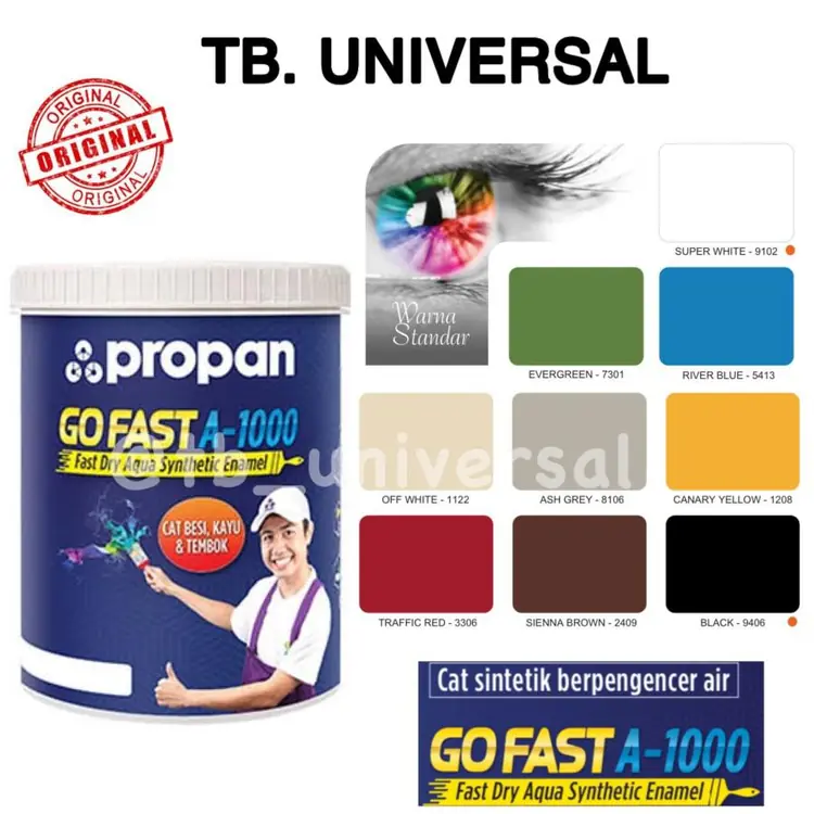 GO FAST A-1000 adalah cat sintetik serba guna berpengencer air yang cepat kering, mempunyai daya lekat yang kuat ke substrat, tahan cuaca, mudah diaplikasikan, warna tahan lama, tidak mudah pudar, mempunyai daya tutup yang baik, ramah lingkungan dan tidak beracun.